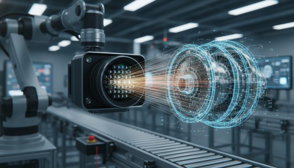 インダストリー4.0の推進に伴い、製造ラインではタクトタイム(製造工程の所要時間)を落とすことなく、ミクロン単位の全数3D検査を行うことが求められています。ここで活躍するのが産業用プレノプティックカメラによる「ワンショット3D」技術です。従来の位相シフト法(構造化照明)は複数回の撮影が必要なため対象物を静止させる必要がありましたが、ライトフィールドカメラは1回のフラッシュ露光(マイクロ秒単位)で高解像度2D画像と高精度な深度マップを同時に取得します。コンベア上を高速で移動する対象物であっても、ブレのない3次元形状を取得できるのです。