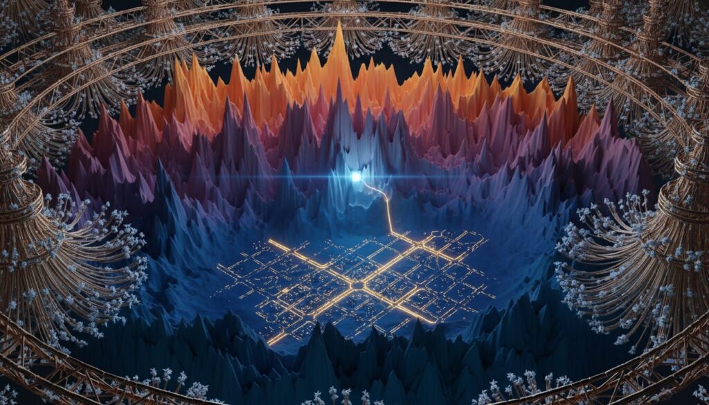 量子アニーリングでは、この自然現象を計算に応用します。解き明かしたい「最適化問題」を、巨大なエネルギーの地形(山と谷からなる風景)に見立てます。この地形で「最も深い谷底」を見つけることが、すなわち「最適な答え」を見つけることになります。