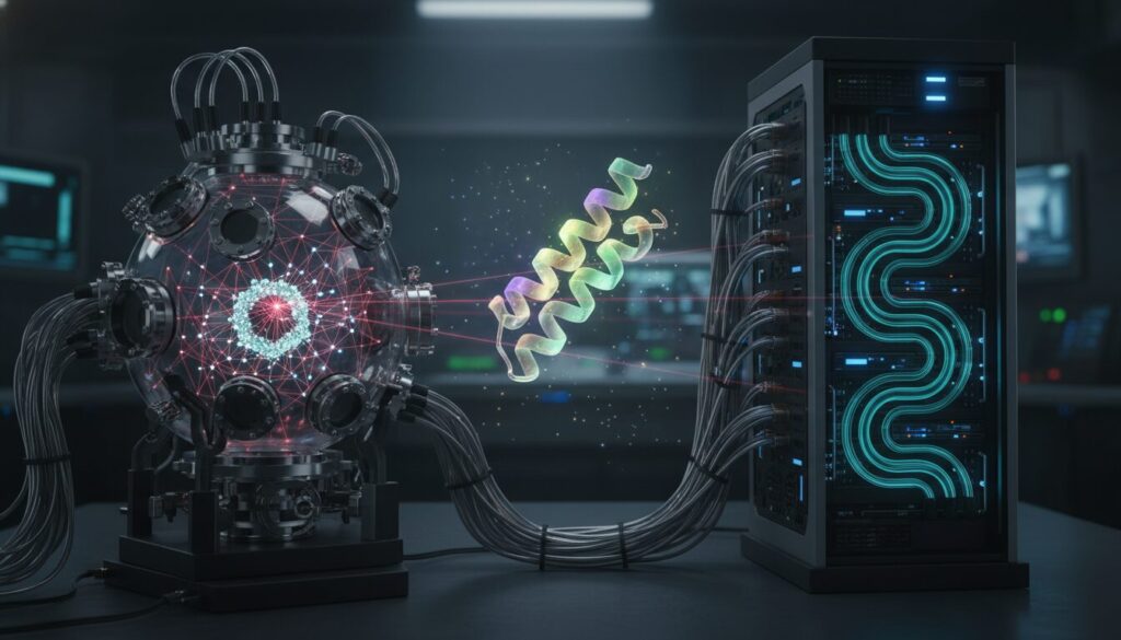 具体的な産業インパクトとして最も期待されているのが、化学・製薬領域です。例えば創薬プロセスにおいて、標的タンパク質の複雑な折りたたみ構造や、候補化合物の結合親和性を高精度に予測するタスクです。従来の古典計算機では数百万の化合物をスクリーニングするのに莫大な時間とコストを要しました。