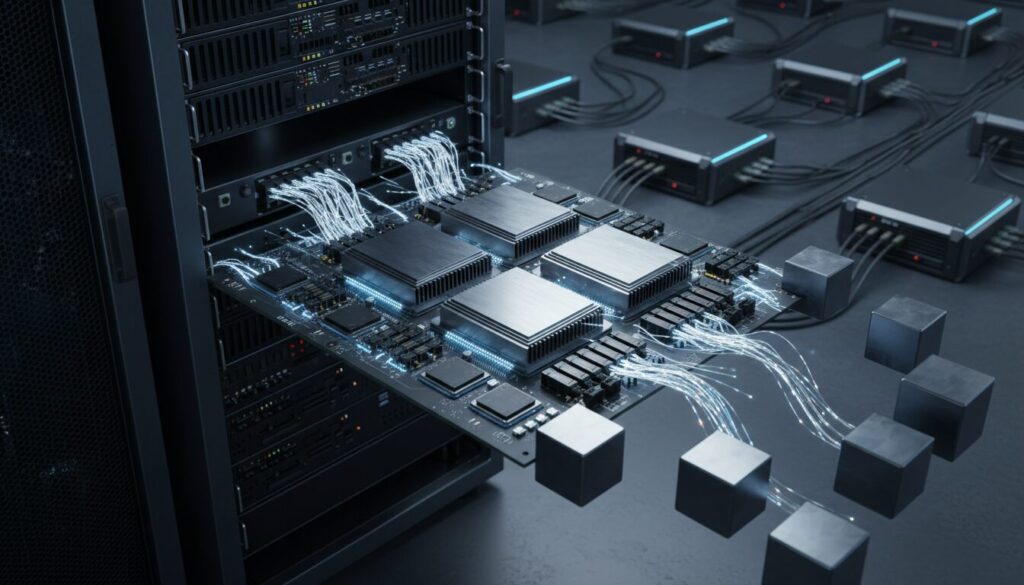 推論インフラにおいて見落とされがちですが、プロセッサ以上に深刻なボトルネックとなるのが「インターコネクト(通信帯域)」と「ストレージI/O」です。巨大モデルが単一のGPUに収まらない場合(テンソル並列による分散推論)、ノード間通信のレイテンシが推論全体の遅延に直結します。